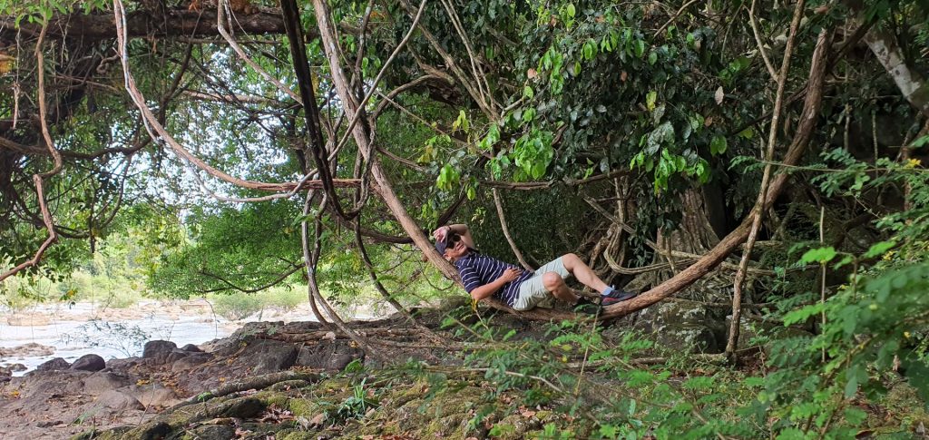 Trưa đến, tôi dừng bên bờ sông, nơi không còn ai. Tôi leo lên một nhánh cây to, nằm ngả lưng, cảm nhận từng cơn gió thổi qua. Ngước mắt lên khoảng trời xanh vắt qua tán lá, nhìn dòng nước trôi chậm dưới chân, tôi chẳng làm gì ngoài việc lắng nghe. Mặt sông phẳng lặng, phản chiếu những vệt nắng vàng, chỉ có tiếng nước vỗ nhẹ vào bờ và tiếng gió xào xạc qua lá. Một khoảnh khắc giản đơn, nhưng đủ để nhận ra mình đang sống — không cần chứng minh điều gì.