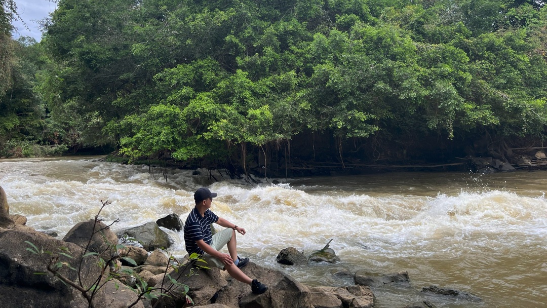 Đường rừng gập ghềnh, đất đỏ trơn trượt, rễ cây lộ ra lẫn lớp lá mục. Ánh nắng xuyên qua tán cây cổ thụ, rải những mảng sáng lung linh trên mặt đất. Tiếng chim, tiếng vượn gọi bầy, gió xào xạc qua lá — mọi thứ vận hành theo nhịp riêng, không vội, không chen lấn. Mỗi vòng bánh xe giúp tôi rời xa nhịp sống quen thuộc, để hòa mình vào hệ sinh thái sống động xung quanh.